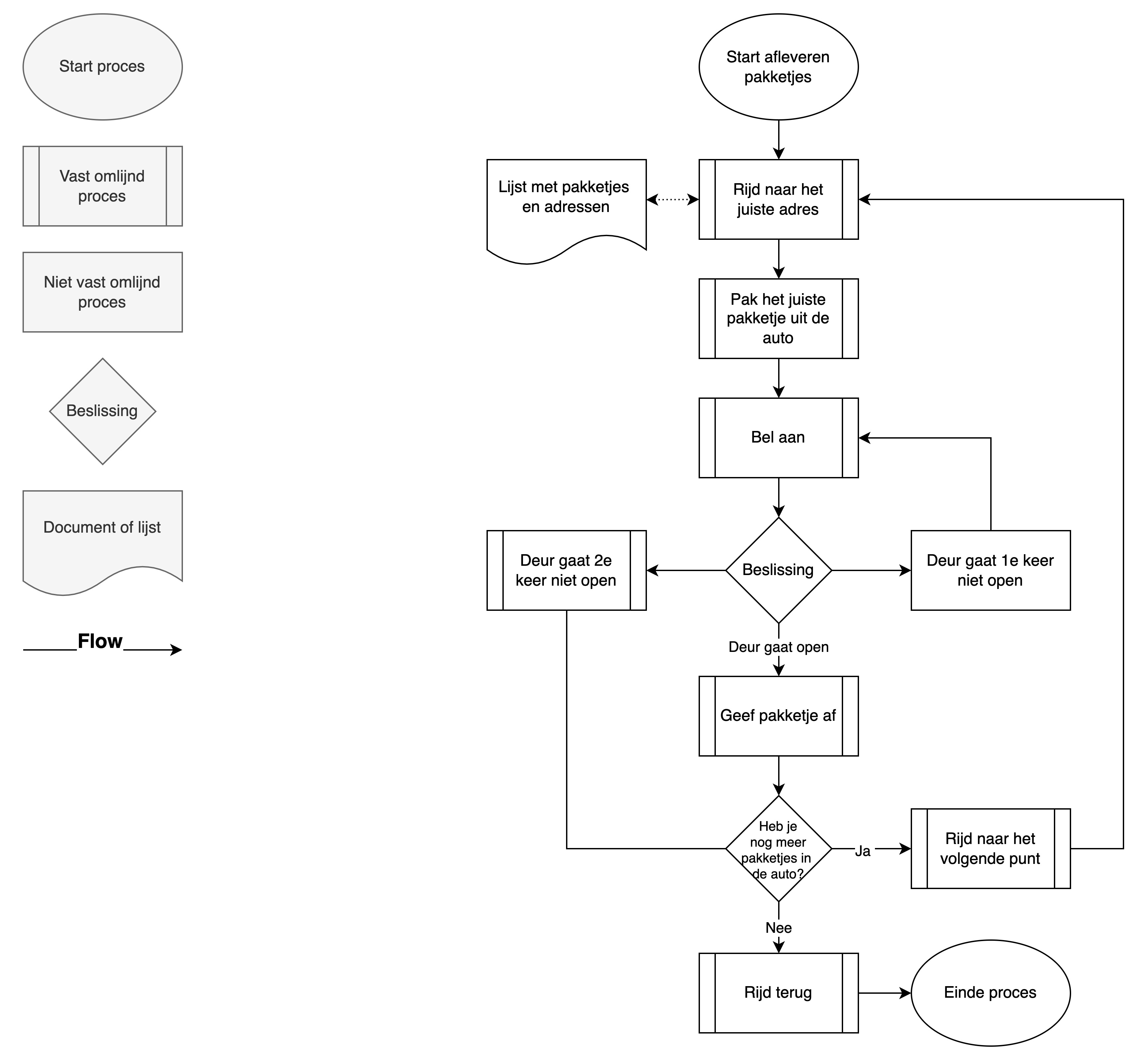 Voor het afleveren van pakketjes is het volgende stroomschema ontworpen.