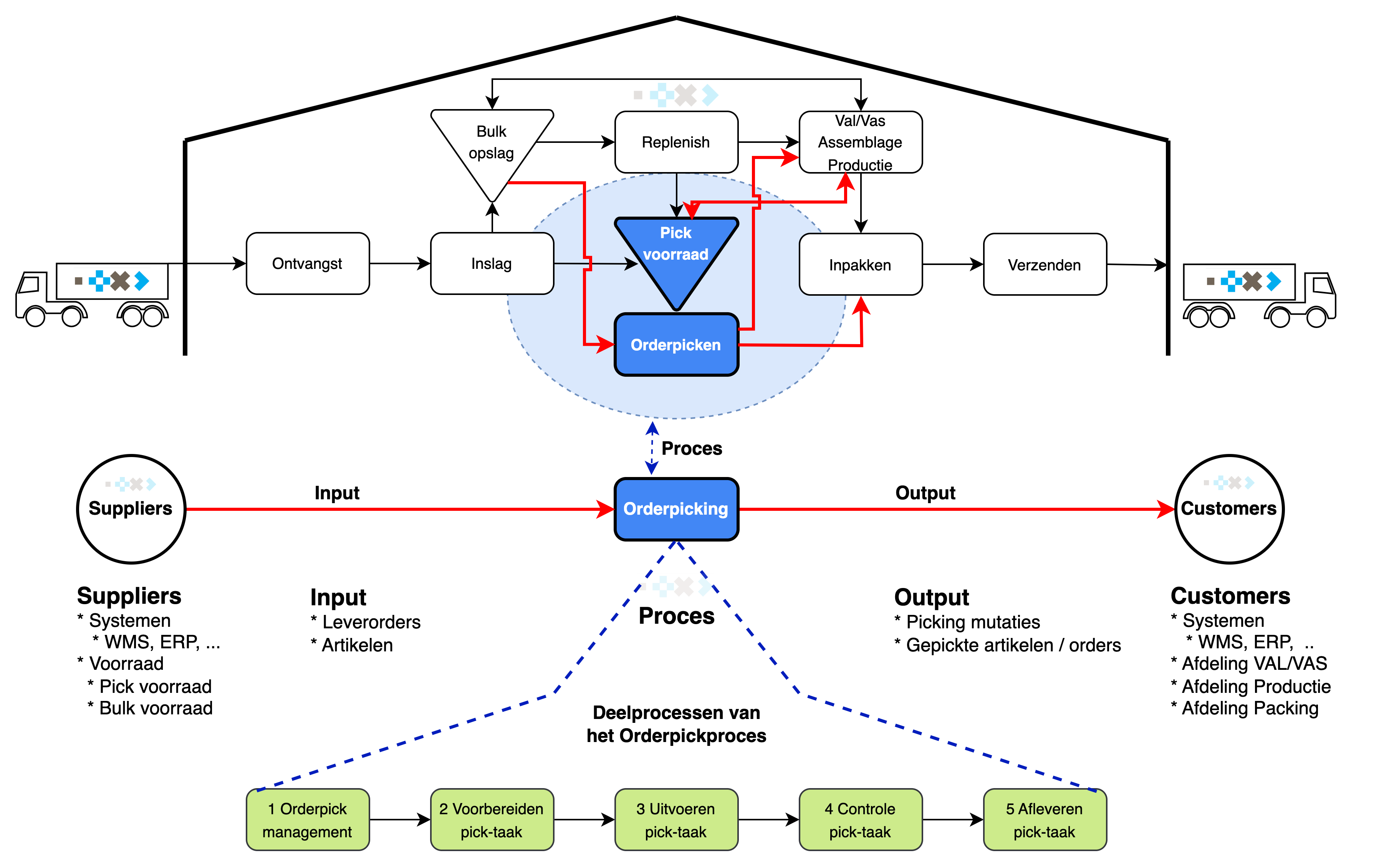 Hierna geven wij onder andere via een SIPOC schema stapsgewijs inzicht in het orderpickproces en een aantal mogelijkheden hoe dit proces verder te optimaliseren. Door middel van diverse linkjes kunt u inzoomen op diverse orderpick hulpmiddelen en kennisleveranciers.